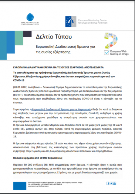 ΕΥΡΩΠΑΪΚH ΔΙΑΔΙΚΤΥΑΚH ΕΡΕΥΝΑ ΓΙΑ ΤΙΣ ΟΥΣΙΕΣ ΕΞΑΡΤΗΣΗΣ: ΑΠΟΤΕΛΕΣΜΑΤΑ Τα αποτελέσματα της πρόσφατης Ευρωπαϊκής Διαδικτυακής Έρευνας για τις Ουσίες Εξάρτησης έδειξαν ότι η χρήση κάνναβης και έκστασι επηρεάζεται περισσότερο από τον COVID-19 (20.01.2022, Λισαβώνα – Λευκωσία). Σήμερα δημοσιεύονται τα α...Διορισμός δυο λειτουργών στην Αρχή Αντιμετώπισης Εξαρτήσεων Κύπρου ΑΑΕΚ