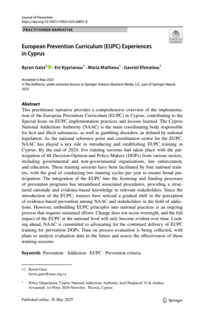 Η ΑΑΕΚ πρωτοπορεί στην εφαρμογή του Ευρωπαϊκού Εγχειριδίου για την Πρόληψη (EUPC) στην Κύπρο. Μέχρι το τέλος του 2024, 68 άτομα-κλειδιά (DOPs) από διάφορους τομείς έχουν εκπαιδευτεί, συμβάλλοντας στη διάδοση των βασικών αρχών της επιστημονικά τεκμηριωμένης πρόληψης. Η ένταξη του EUPC στη διαδικασία ...