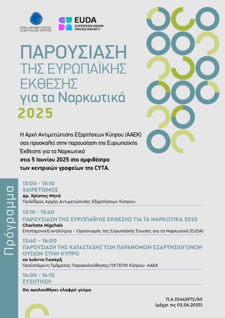 Η ευρωπαϊκή έκθεση για τα ναρκωτικά 2025 αποτυπώνει την κατάσταση των ναρκωτικών στην Ευρώπη βάσει των πιο πρόσφατων διαθέσιμων στοιχείων. Η ευρωπαϊκή αγορά ναρκωτικών εξελίσσεται ραγδαία, καθώς τόσο οι προμηθευτές όσο και οι χρήστες βρίσκουν τρόπους για να προσαρμοστούν στη γεωπολιτική αστάθεια, τ...Παρουσίαση της Ευρωπαϊκής Έκθεσης για τα Ναρκωτικά 2025 και στοιχεία για την κατάσταση του φαινομένου στην Κύπρο