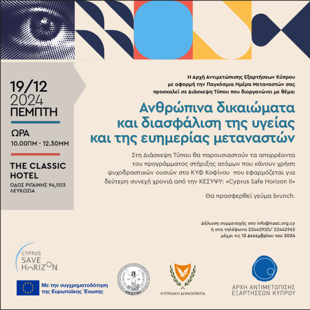 Μέσα στο πλαίσιο της Παγκόσμιας Ημέρας Μεταναστών η Αρχή Αντιμετώπισης Εξαρτήσεων Κύπρου (ΑΑΕΚ), σας προσκαλεί σε διάσκεψη τύπου που θα διοργανώσει στις 19 Δεκεμβρίου του 2024 με θέμα: "Ανθρώπινα Δικαιώματα και Διασφάλιση της Υγείας κα της Ευημερίας Μεταναστών". Στη διάσκεψη τύπου που θα πραγματοποι...Εβδομάδα Ευαισθητοποίησης για το αλκοόλ