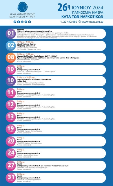 Η Αρχή Αντιμετώπισης Εξαρτήσεων Κύπρου (ΑΑΕΚ), δέχεται προτάσεις με στόχο την εφαρμογή προληπτικού προγράμματος που να απορρέει από την Εθνική Στρατηγική για την Αντιμετώπιση της Εξάρτησης 2021- 2028 και το Σχέδιο Δράσης 2021-2024, ενώ θα εξυπηρετεί παιδιά και εφήβους που ανήκουν σε ευάλωτες ομάδες...Εκδηλώσεις με αφορμή την Παγκόσμια Ημέρα κατά των Ναρκωτικών 26η Ιουνίου 2024