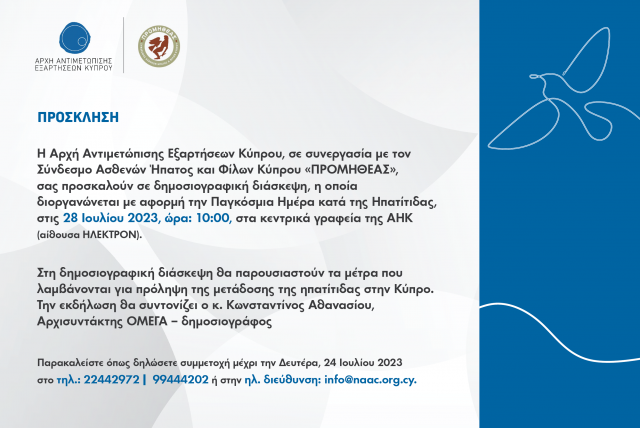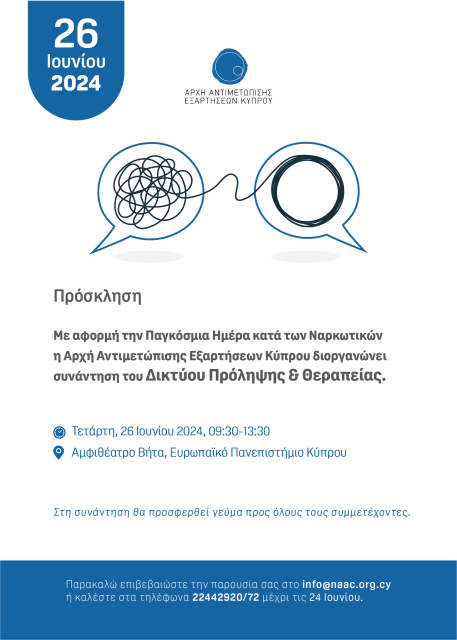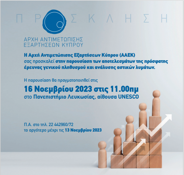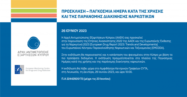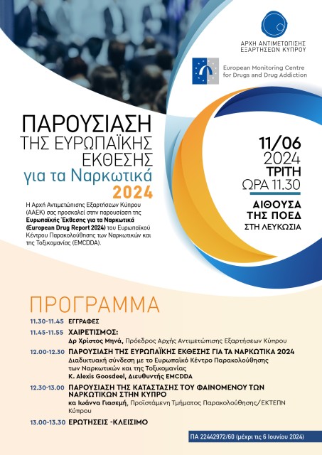 Η Αρχή Αντιμετώπισης Εξαρτήσεων Κύπρου (ΑΑΕΚ) σας προσκαλεί στην Παρουσίαση της Ευρωπαϊκής Έκθεσης για τα Ναρκωτικά 2024, στις 11 Ιουνίου στις 11:30π.μ στην αίθουσα της ΠΟΕΔ στη Λευκωσία.