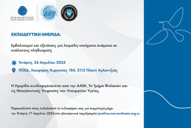 Η ΑΑΕΚ, το Τμήμα Φυλακών και οι Νοσηλευτικές Υπηρεσίες του Υπουργείου Υγείας, μέσα στα πλαίσια του Ευρωπαϊκού προγράμματος RISE-Vac, σας προσκαλούν σε εκπαιδευτική ημερίδα με θέμα “Εμβολιασμοί και εξετάσεις για λοιμώδη νοσήματα ανάμεσα σε ευάλωτους πληθυσμούς” η οποία θα διεξαχθεί στις 24 Απριλίου 2...