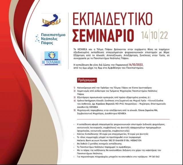 To ΚΕΝΘΕΑ και η Τόλμη Πάφου, σε συνεργασία με το Πανεπιστήμιο Νεάπολις Πάφου, διοργανώνουν εξειδικευμένη εκπαίδευση επαγγελματιών ψυχοκοινωνικών επιστημών με θέμα: «Εξάρτηση από το Αλκοόλ: Αποτοξίνωση, Απεξάρτηση, Συνέπειες στην υγεία». Η εκπαίδευση θα λάβει μέρος την Παρασκευή, 14 Οκτωβρίου, μεταξ...10 Οκτωβρίου, Παγκόσμια Ημέρα Ψυχικής Υγείας