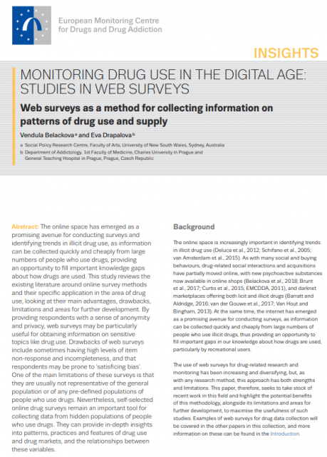 Η παρούσα δημοσίευση του EMCDDA, εξετάζει την υπάρχουσα βιβλιογραφία γύρω από τις διαδικτυακές μεθόδους έρευνας και την ειδική εφαρμογή τους στον τομέα της χρήσης εξαρτησιογόνων ουσιών, εξετάζοντας τα κύρια πλεονεκτήματα, τα μειονεκτήματα, τους περιορισμούς και τους τομείς για περαιτέρω ανάπτυξη. Γι...Παρουσίαση της Ευρωπαϊκής Έκθεσης για τα Ναρκωτικά, 2022