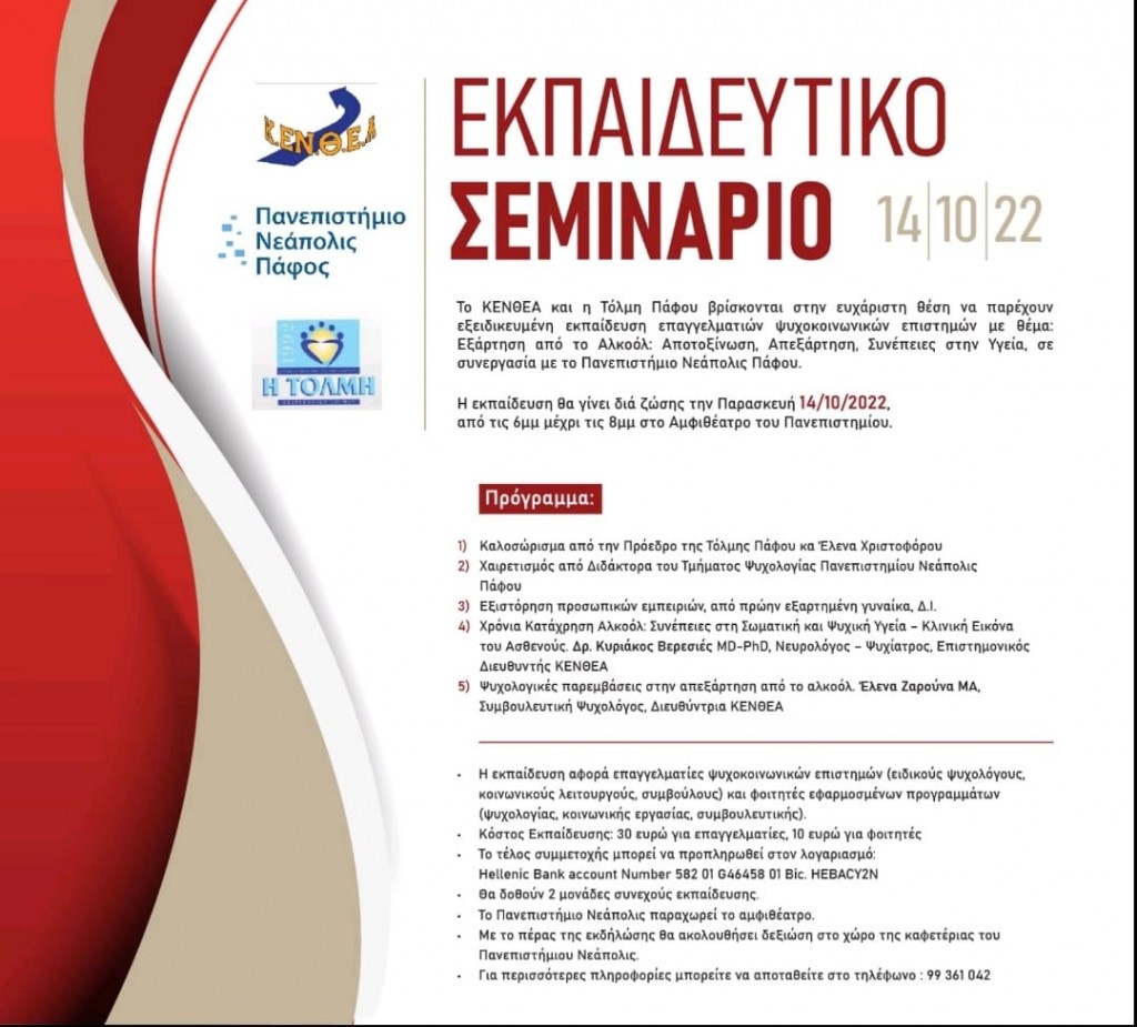 To ΚΕΝΘΕΑ και η Τόλμη Πάφου, σε συνεργασία με το Πανεπιστήμιο Νεάπολις Πάφου, διοργανώνουν εξειδικευμένη εκπαίδευση επαγγελματιών ψυχοκοινωνικών επιστημών με θέμα: «Εξάρτηση από το Αλκοόλ: Αποτοξίνωση, Απεξάρτηση, Συνέπειες στην υγεία».