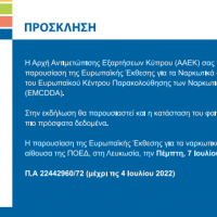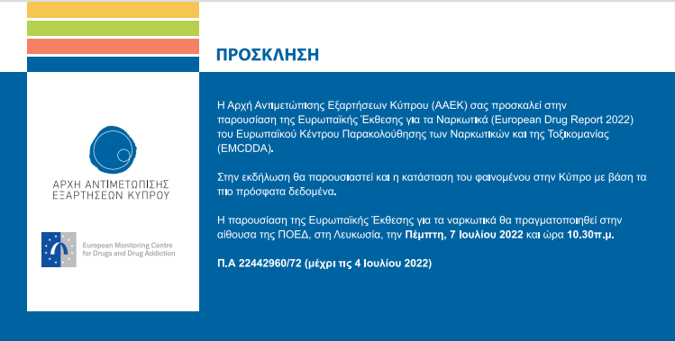 Η Αρχή Αντιμετώπισης Εξαρτήσεων Κύπρου (ΑΑΕΚ) σας προσκαλεί στην Παρουσίαση της Ευρωπαϊκής Έκθεσης για τα Ναρκωτικά, στις 7 Ιουλίου 2022, στις 10:30 πμ στην Αίθουσα της ΠΟΕΔ, στη Λευκωσία.