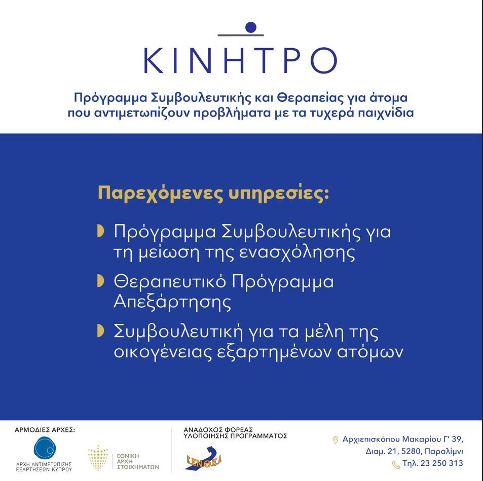 Η Αρχή Αντιμετώπισης Εξαρτήσεων Κύπρου και η Εθνική Αρχή Στοιχημάτων ανακοινώνουν την έναρξη λειτουργίας του Θεραπευτικού Κέντρου «Κίνητρο» στην Επαρχία Αμμοχώστου, το οποίο απευθύνεται σε ενήλικες οι οποίοι παρουσιάζουν προβληματική ή παθολογική συμπεριφορά σε σχέση με την ενασχόληση τους με τα τυχερά παιχνίδια. Το Κέντρο «Κίνητρο» προσφέρει τις πιο κάτω δωρεάν υπηρεσίες προς το κοινό: